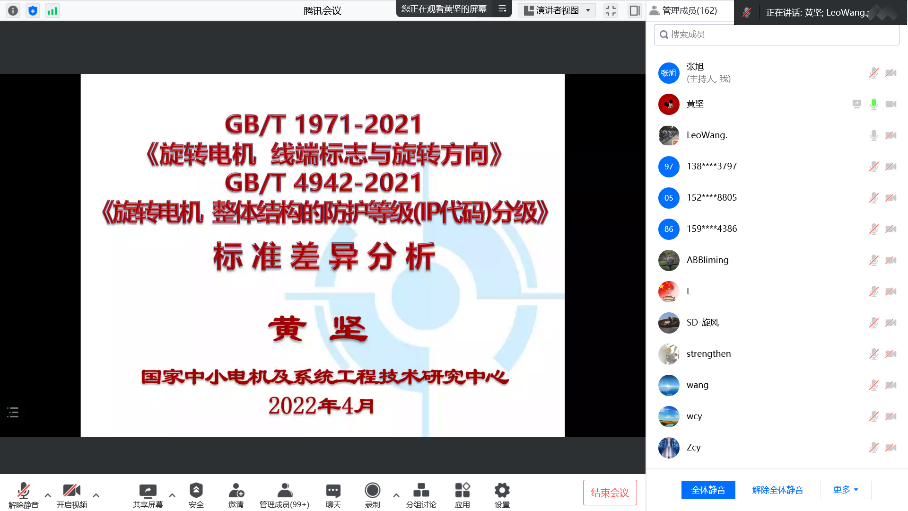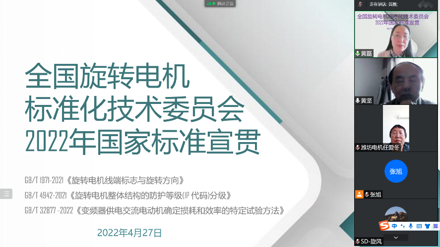 | 2022年4月27日,國家標(biāo)準線上宣貫會準時召開。會議由秘書處黃磊主持。首先簡要介紹了本次會議宣講的三項國家標(biāo)準GB/T 32877-2022《變頻器供電交流電動機確定損耗和效率的特定試驗方法》、GB/T1971-2021《旋轉(zhuǎn)電機 線端標(biāo)志與旋轉(zhuǎn)方向》和GB/T 4942-2021《旋轉(zhuǎn)電機整體結(jié)構(gòu)的防護等級(IP代碼)分級》的批準發(fā)布及實施情況。 |