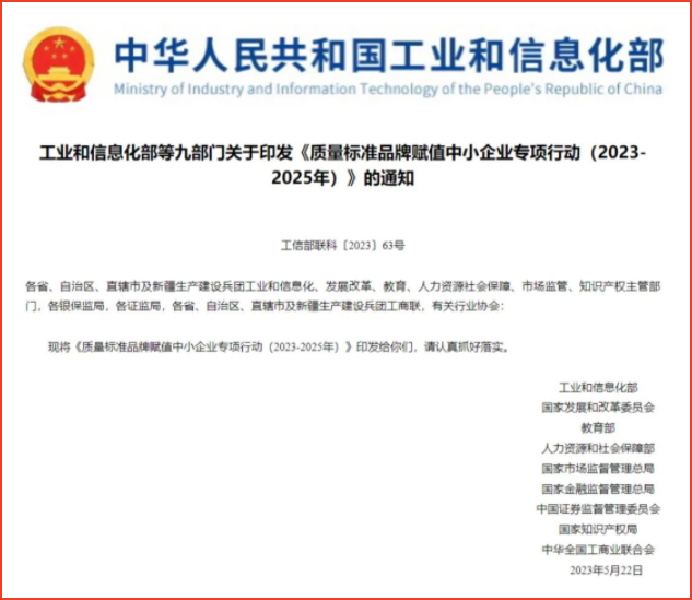 工業(yè)和信息化部等九部門關(guān)于印發(fā)《質(zhì)量標(biāo)準(zhǔn)品牌賦值中小企業(yè)專項(xiàng)行動(2023-2025年)》的通知