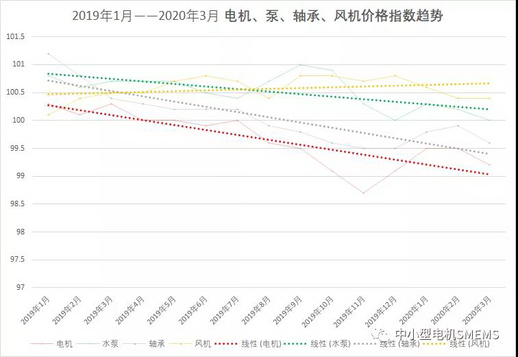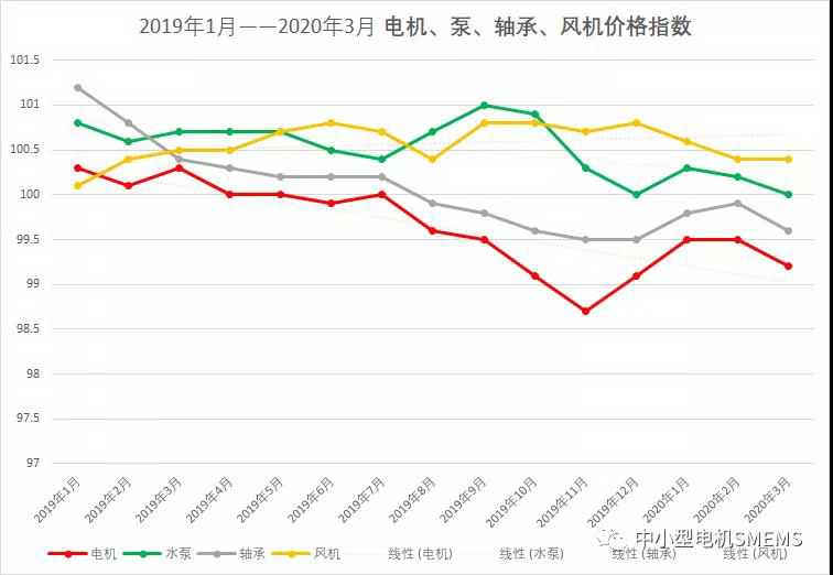 從2019年1月至2020年3月以來,電機(jī)出廠價格指數(shù)呈下降趨勢;軸承出廠價格指數(shù)亦在下降;水泵的下降趨勢稍微平緩;而風(fēng)機(jī)的出廠價格指數(shù)則緩步上升。