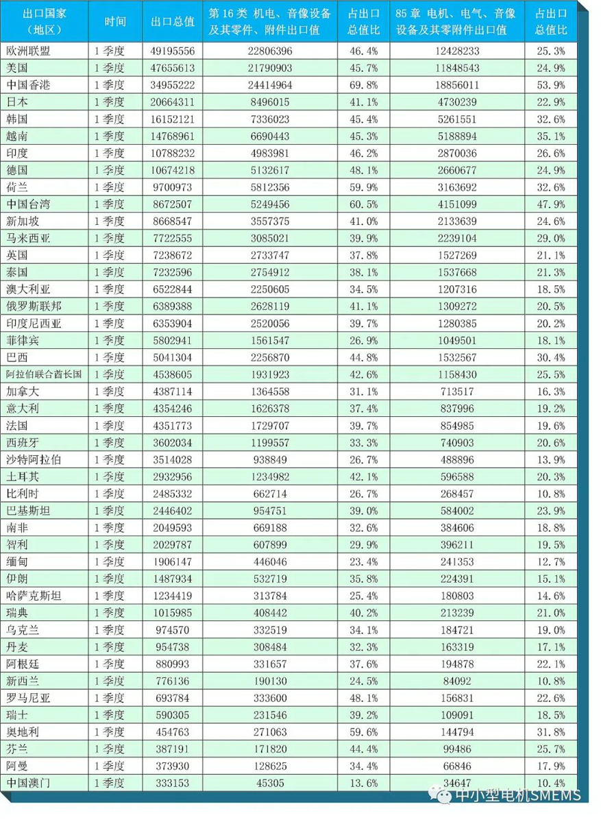 據(jù)海關(guān)總署統(tǒng)計,經(jīng)中小型電機分會整理(見下表),位居前十的出口國家(地區(qū))為歐洲聯(lián)盟、美國、中國香港、日本、韓國、越南、印度、德國、荷蘭、中國臺灣。